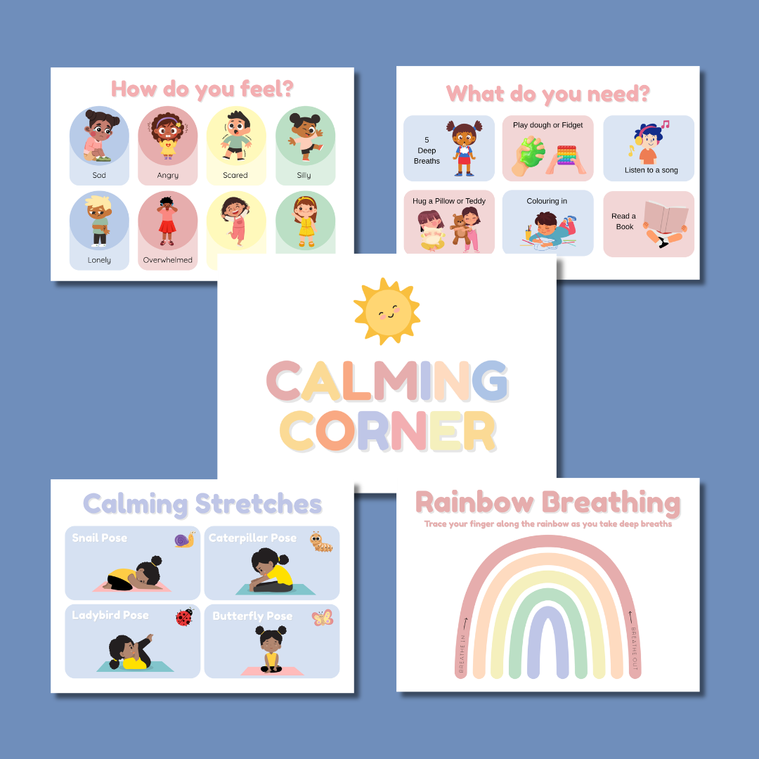 Set up a designated space with a chair / pillow. You can print out the posters and stick them on the wall. You can add 3-5 calming tools into this space such as a favourite book, cuddly teddy, play dough, night light, fidget toy, colouring book etc.